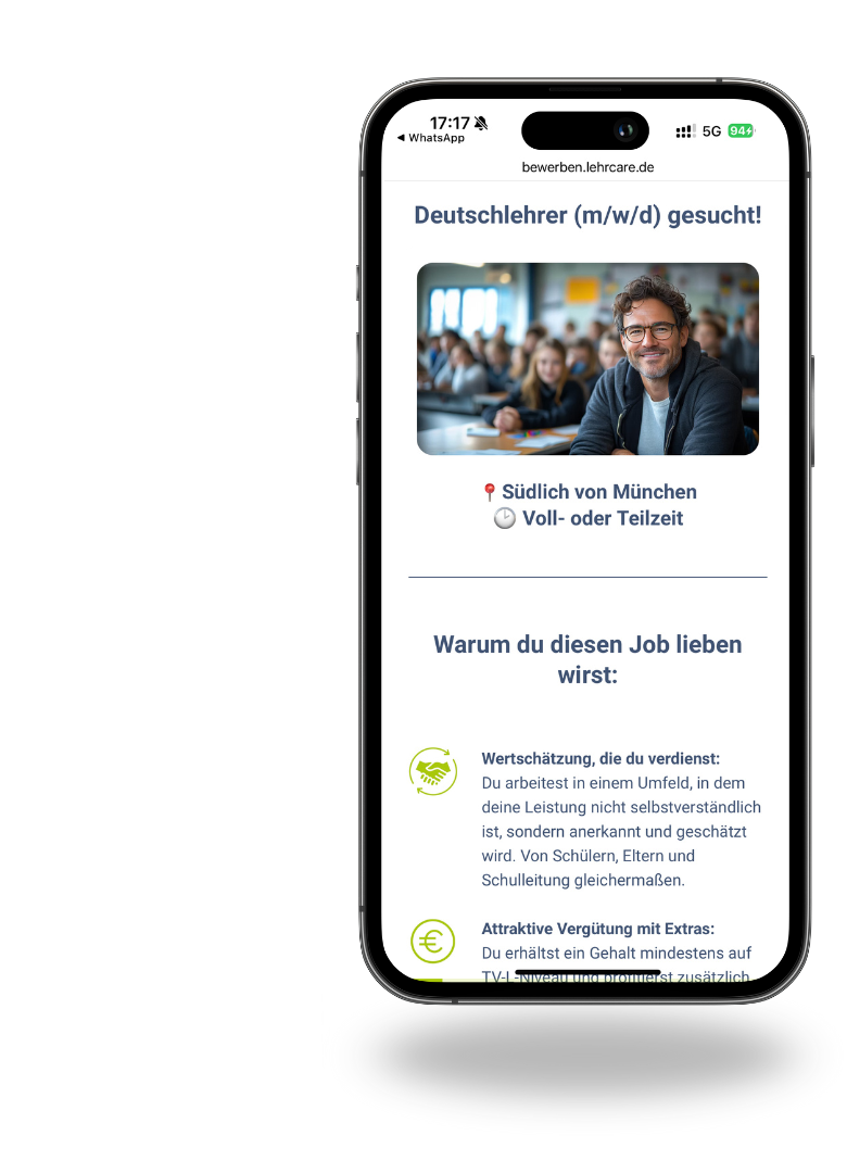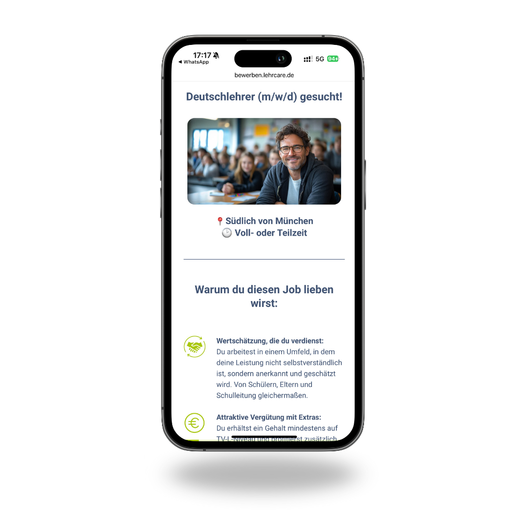 Wir holen Kandidaten mit klarer Rollenbeschreibung, starken Benefits und einem individuellen Funnel ab – ohne Hürden, aber mit gezielter Vorqualifizierung.